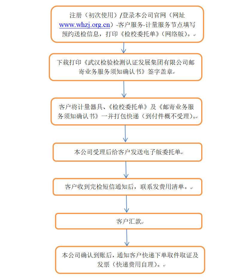 1、郵寄業務必須通過本公司官網預約,并打印《檢校委托單》(網絡版)、《武漢檢驗檢測認證發展集團有限公司郵寄業務服務須知確認書》隨計量器具一同打包快遞。(本公司官網www.riffberg.com.cn)